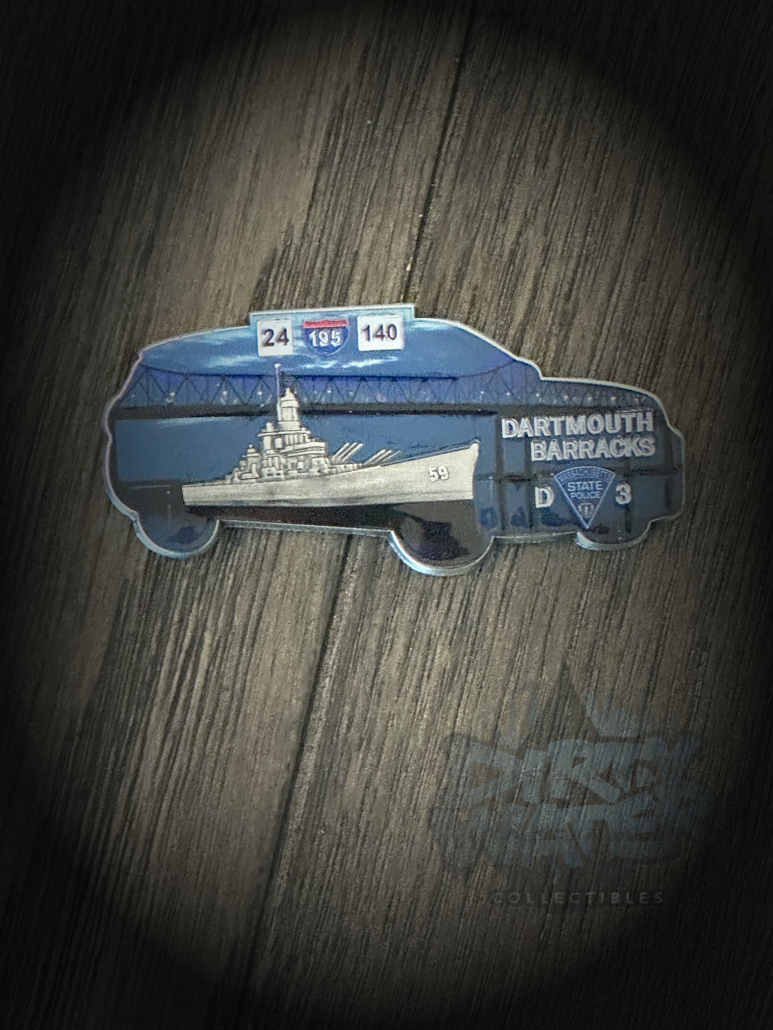 - Back Side: Showcases a tribute to Dartmouth with a design shaped like the cruiser’s profile. It depicts the Battleship USS Massachusetts (BB-59) beneath a bridge, alongside highway shields for Routes 24, 195, and 140—major roadways in the barracks’ patrol area. “DARTMOUTH BARRACKS” and “STATE POLICE D3” are proudly displayed.